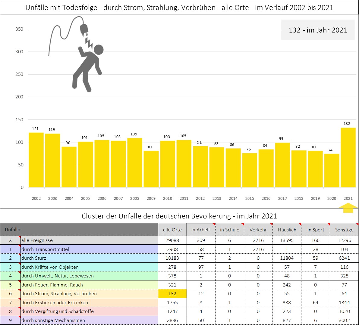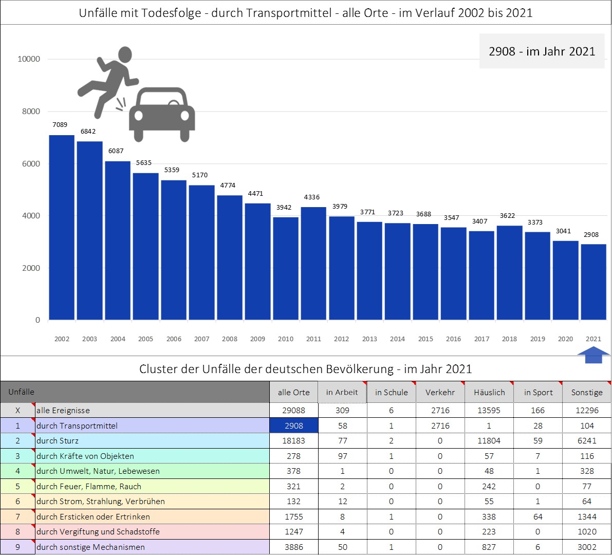 Die Matrix untergliedert sämtliche tödlichen Unfälle nach Ereignissen und Orten im Jahr 2021. Die Statistik darüber zeigt eine komprimierte Zusammenstellung der letzten zwanzig Jahre. Grundlage hierfür sind die Todesbescheinigungen, gemäß ICD10-Konvention.