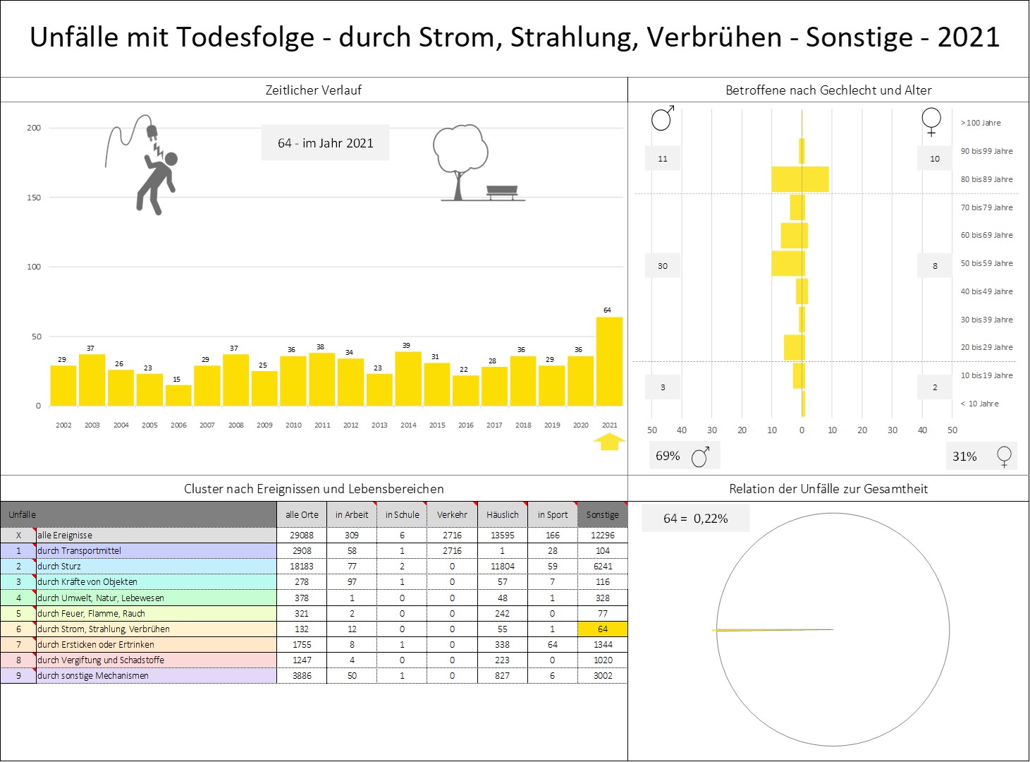 Daten sind mitunter uneinheitlich z.B. Brandtote gem. Feuerwehrverband und des Statistischen Bundesamtes (StBA). Erstere stellen Ihre Sichtweise auf den Rettungsdienst an sich ab, Zweitere stellen auf das Merkmal eines Unfalls – sprich die fehlende Absicht ab. In Abstimmung mit Statista sind die u.g. Quelldaten der GBE prioritär.