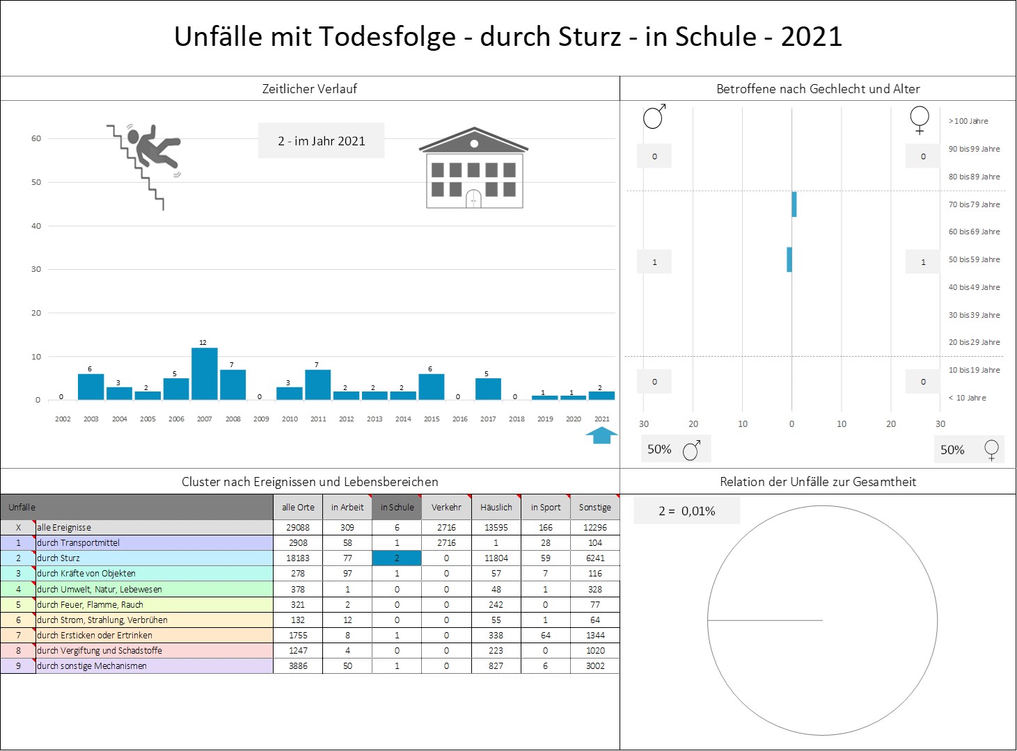 Das ‚Kuchendiagramm‘ stellt die jeweilige Auswahl in den Gesamtkontext desselben Jahres. Aus statistischer Sicht werden Unfälle seit jeher zu etwa 75% von Verkehrs- und Sturzunfällen dominiert. Die Abnahme tödlicher Verkehrsunfälle ist in etwa pari mit der Zunahme der tödlichen Stürze.